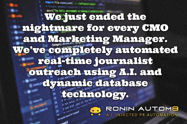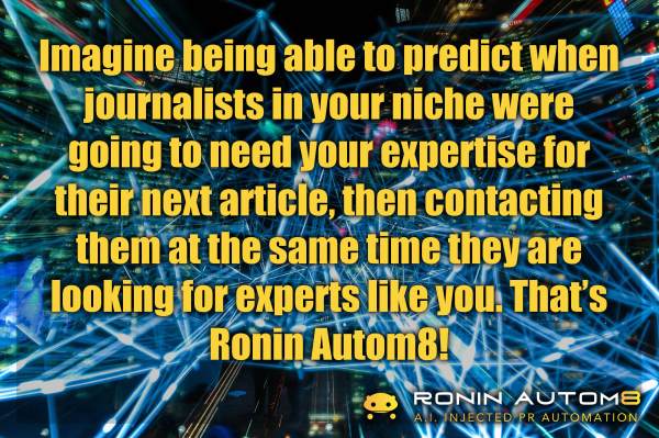 As the first A.I. fueled media outreach automation tool, Ronin Autom8 will be the beginning of your company’s industry niche, media domination! Never before has a machine been developed that is so affordable, so fast, so calculating and so precise that from the time your company starts utilizing this technology, you’ll be first in line for any media coverage. For virtually every opportunity to be interviewed for your industry niche, our technology places you directly in front of the line with a personalized email introduction that delivers such mind-blowing results that it has to be experienced to be fully appreciated!